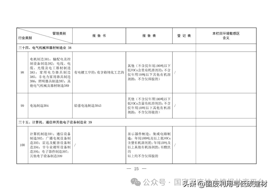 4. 强化“两高”项目准入管理 一是强化部分涉有毒有害、涉重点重金属、涉“三致”物质排放项目的环评管理。例如,对农药制造项目,全部纳入报告书管理;对环境风险高、环境影响复杂的电镀、化学原料药等项目,持续加强环评管理。 二是对新出现的环境影响复杂的项目提高环评管理要求。例如,对环境影响尚不明确,需加强规范管理的新型掺烧或者协同处置的火电、水泥制造等项目,进一步强化环评管理。 三是明确相关行业“高污染”燃料类型。例如,以“煤、煤矸石、石油焦、油、 油页岩或者发生炉煤气”为燃料的玻璃制品、玻璃纤维、陶瓷制品、耐火材料制造等项目,明确要求纳入环评报告书管理。 5. 强化生态影响类项目环评管理 一是水利水电项目,明确将具有拦蓄功能的水利枢纽工程纳入报告书管理,将常规水电全部纳入报告书管理。 二是交通类项目,强化涉环境敏感区项目环评准入要求,将涉及环境敏感区内新增永久占地、列车运行速度或对数显著增加的改建铁路提级为报告书。 三是采掘类项目,进一步加强涉独立尾矿库项目环评管理,明确有色矿、化学矿等的独立尾矿库项目编制报告书。 6. 衔接好排污许可分类管理名录 一是行业类别上,推动环评分类管理名录与排污许可分类管理名录在行业类别划分上相统一,将污染影响类行业类别对应国民经济第三级行业分类,增加锅炉、炉窑、表面处理、水处理4个通用工序。 二是管理类别上,基本实现环评的报告书与排污许可的重点管理相一致,制糖业、玻璃制品、黑色金属冶炼、有色金属冶炼等行业完全一致。明确水泥窑协同处置固体废弃物项目统一归为水泥行业。 三是管理承接上,取消卷烟制造、服装、服饰业等一批环境影响明确、措施成熟且排污许可有效承接的报告表。 四是统一挥发性有机物(VOCs)管理尺度,环评与排污许可名录均以年用低VOCs含量有机溶剂100吨、其他有机溶剂10吨作为管理类别划分依据。 总之,新《名录》围绕提升源头预防整体效能、服务高质量发展的目标,充分吸纳各地试点探索经验, 将实践证明行之有效的改革经验规范化、制度化,对于推动构建生态环境分区管控、规划环评、项目环评、排污许可有效衔接的制度体系,有着重要意义和积极作用。 关于公开征求《建设项目环境影响评价分类管理名录(修订征求意见稿)》意见的函环办便函〔2025〕397号为深入贯彻党的二十大和二十届三中、四中全会精神,进一步深化环境影响评价制度改革,我部决定对《建设项目环境影响评价分类管理名录(2021年版)》进行修订,并起草了《建设项目环境影响评价分类管理名录(修订征求意见稿)》,现公开征求意见。 各机关团体、企事业单位和个人均可提出意见和建议。 有关意见请书面反馈我部,电子版材料请同时发至联系人邮箱。 征求意见截止时间为2026年1月5日。 联系人:环境影响评价与排放管理司 胡笑浒 环境工程评估中心 李晓举 电话:(010)65646189、84756918 地址:北京市东城区东安门大街82号 邮编:100006
